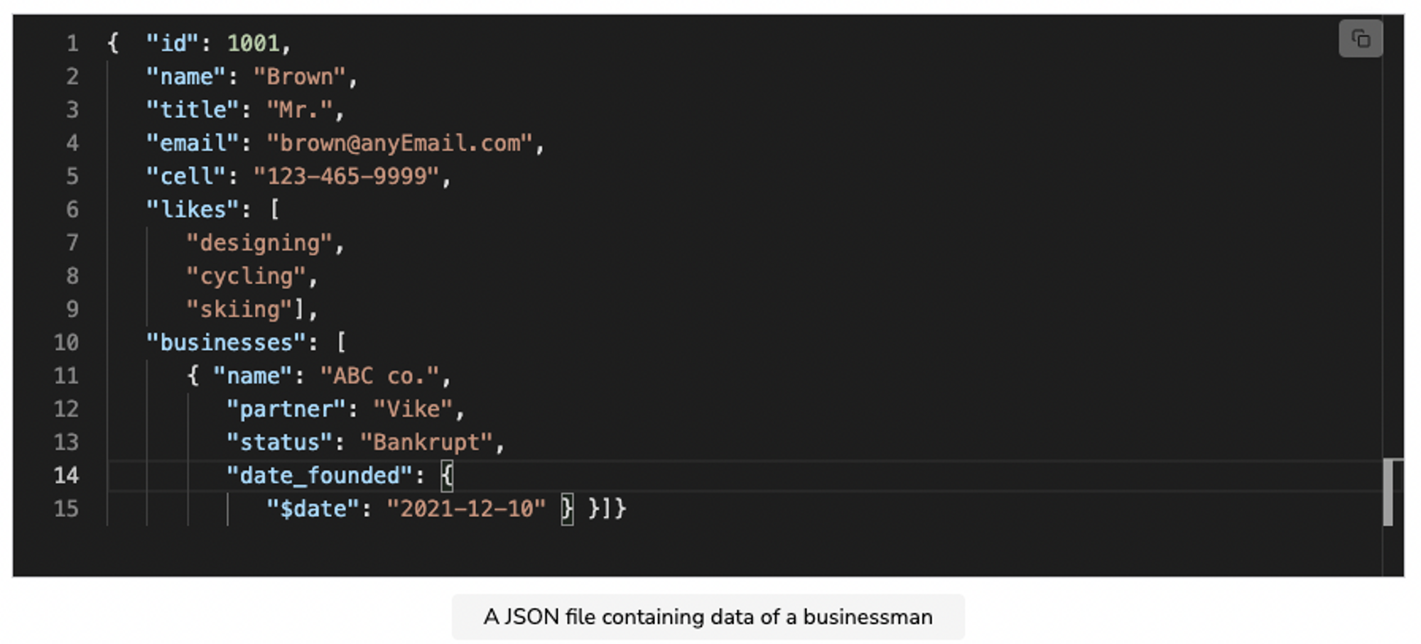 아래는 JSON 문서로 저장된 데이터 예이다. 이 데이터는 한 사람에 관한것으로 id, name, email 등의 다양한 속성이 하나의 파일에 저장된다.
