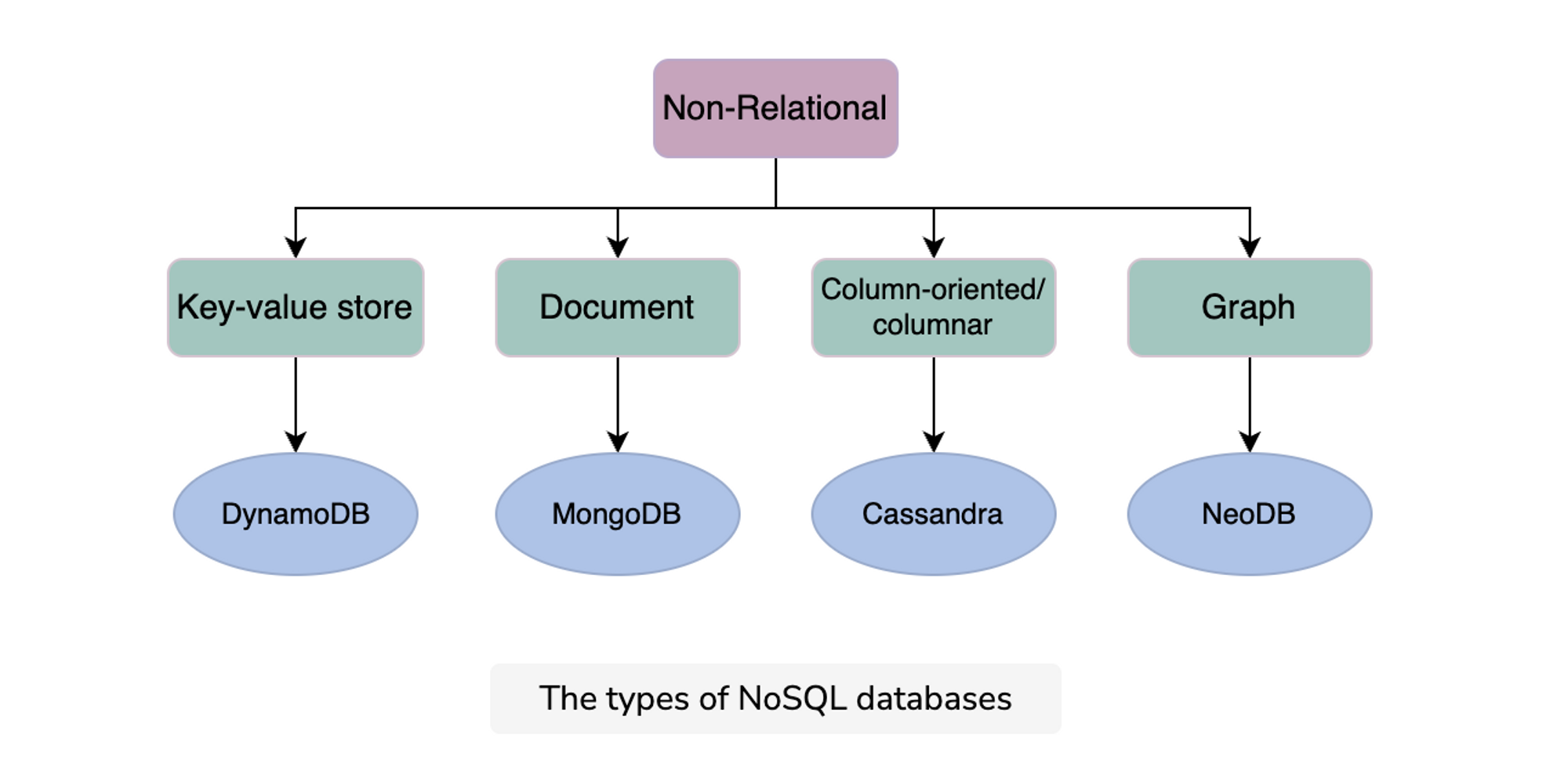 NoSQL DB 는 문서 저장소, 컬럼 DB, Key-Value DB 및 그래프 DB 를 포함하여 다양한 범주로 나뉜다.